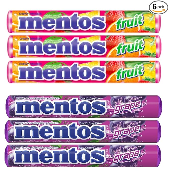 About This Item Mentos Chewy Mint Candy Roll, Fruits And Grape FlavourPack Of 6, (6x29g) Superbly strong flavoured mints for a super fresh andever pleasant breath Easy to carry and apt for outings or breaks or movies orpicnics or just anywhere New Mentos incredible chew! A new chew stick pack with aunique chewing experience Weight 174 Grams Ingredient Type Vegetarian Brand Astonished Retail Item package quantity 1 Occasion Rakshabandhan, New Year, Diwali, Anniversary, Birthday Form Taffy Manufacturer PT.PERFETTI VAN MELLE INDONESIA, BOGOR-16912, INDONESIA Net Quantity 1 count Product Dimensions 10.5 x 12 x 12 cm; 174 g Ingredients FRUITS,GRAPE Country of Origin Indonesia